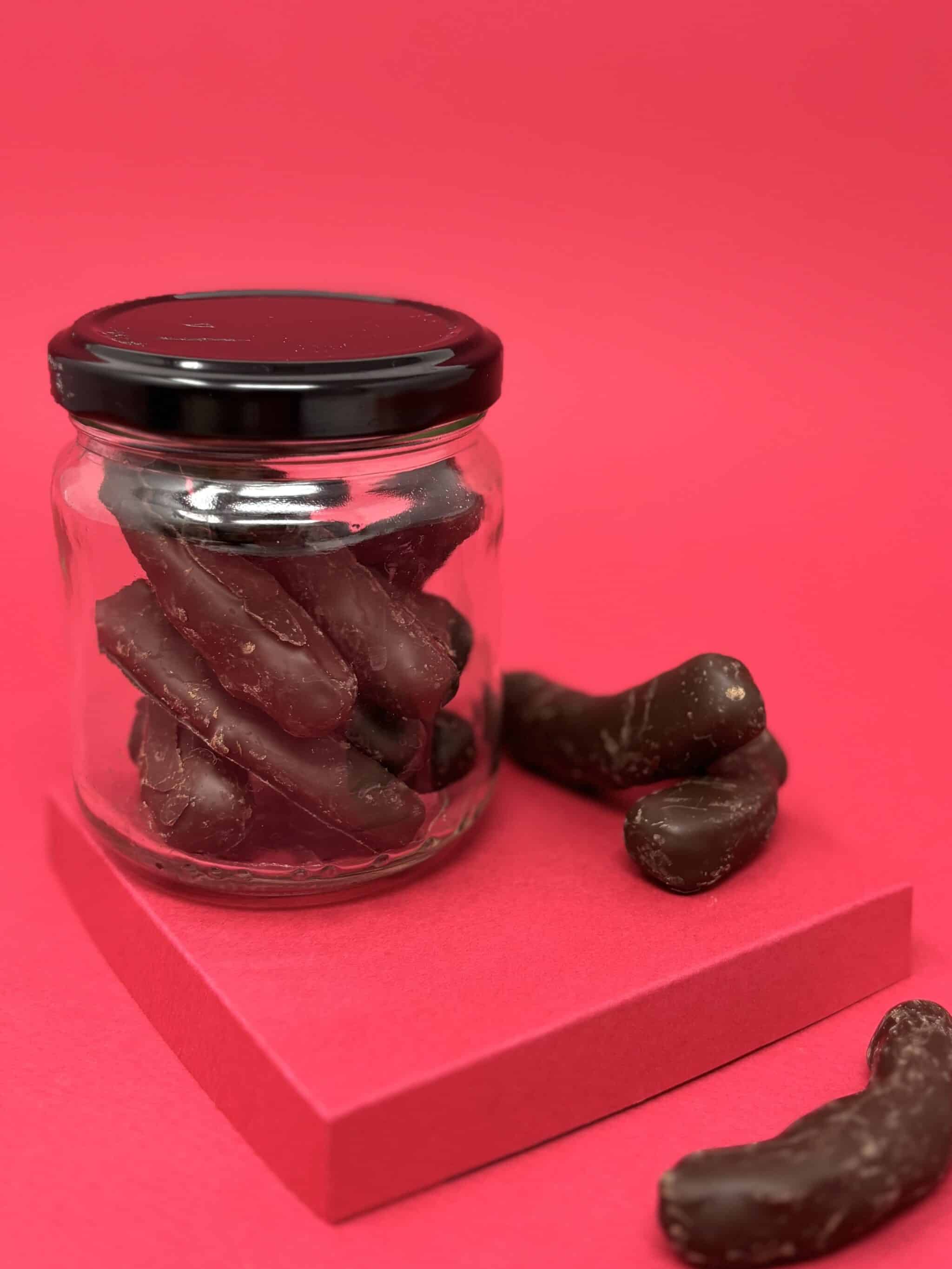 Écorces confites d’orange* 60% (écorce d’orange* 54%, sirop de glucose*, sucre de canne*), chocolat noir* 40% (pâte de cacao, sucre de canne*, beurre de cacap*).