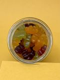 Sirop de glucose*, sucre de betterave*, pomme* 0,9 %, orange* 0,78 %, citron* 0,52 %, cassis* 0,52 %, ananas* 0,5 %, jus concentré de framboise* 0,25 %, gélifiant : pectine ; correcteurs d’acidité : tartrate de sodium, tartrate de potassium ; régulateur d’acidité : acide citrique ;
