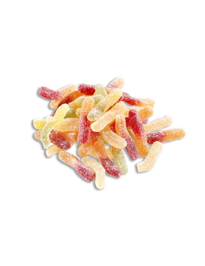 Sirop de glucose, sucre, agent gélifiant : (carraghénane), acide : (acide citrique, acide lactique), régulateur d’acidité : (citrate de sodium), arôme naturel, huile essentielle d’orange, huile essentielle de citron, arôme naturel de citron vert et autres arômes naturels, colorant alimentaire : (concentrés de cassis, carotte, pomme, potiron et algues), amidon de blé (traces).