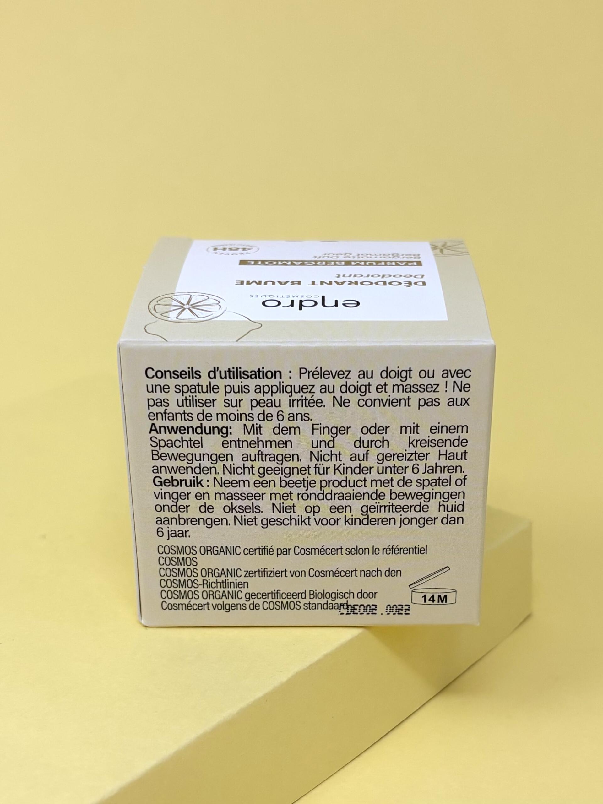 Son efficacité 48H et son odeur fraîche et acidulée ont fait de ce déodorant un de nos best-sellers. Sa texture fondante en baume va neutraliser les mauvaises odeurs sans bloquer le processus de transpiration grâce au bicarbonate de sodium et aux huiles essentielles de Bergamote et d'Arbre à thé. Sans sels d’aluminium, sans alcool, sans conservateurs, il ne contient aucun ingrédient dangereux pour la santé et est l'alternative idéale aux déodorants conventionnels. Livré avec sa spatule en bois pour prélever le produit. Application au doigt. Durée d’utilisation moyenne : 2 à 3 mois. Application le matin, sur peau propre et sèche.