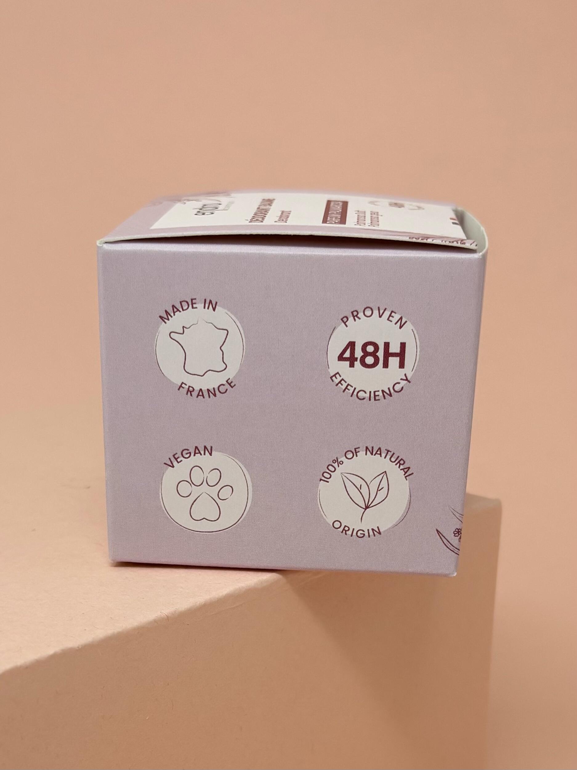 Son efficacité et son odeur douce et fleurie en font le déodorant parfait pour tous les jours. Sa texture fondante en baume va neutraliser les bactéries responsables des mauvaises odeurs sans bloquer le processus de transpiration. Efficacité 48H ! Livré avec sa spatule en bois pour prélever le produit. Application au doigt. Durée d’utilisation moyenne : 2 à 3 mois. Application le matin, sur peau propre et sèche.