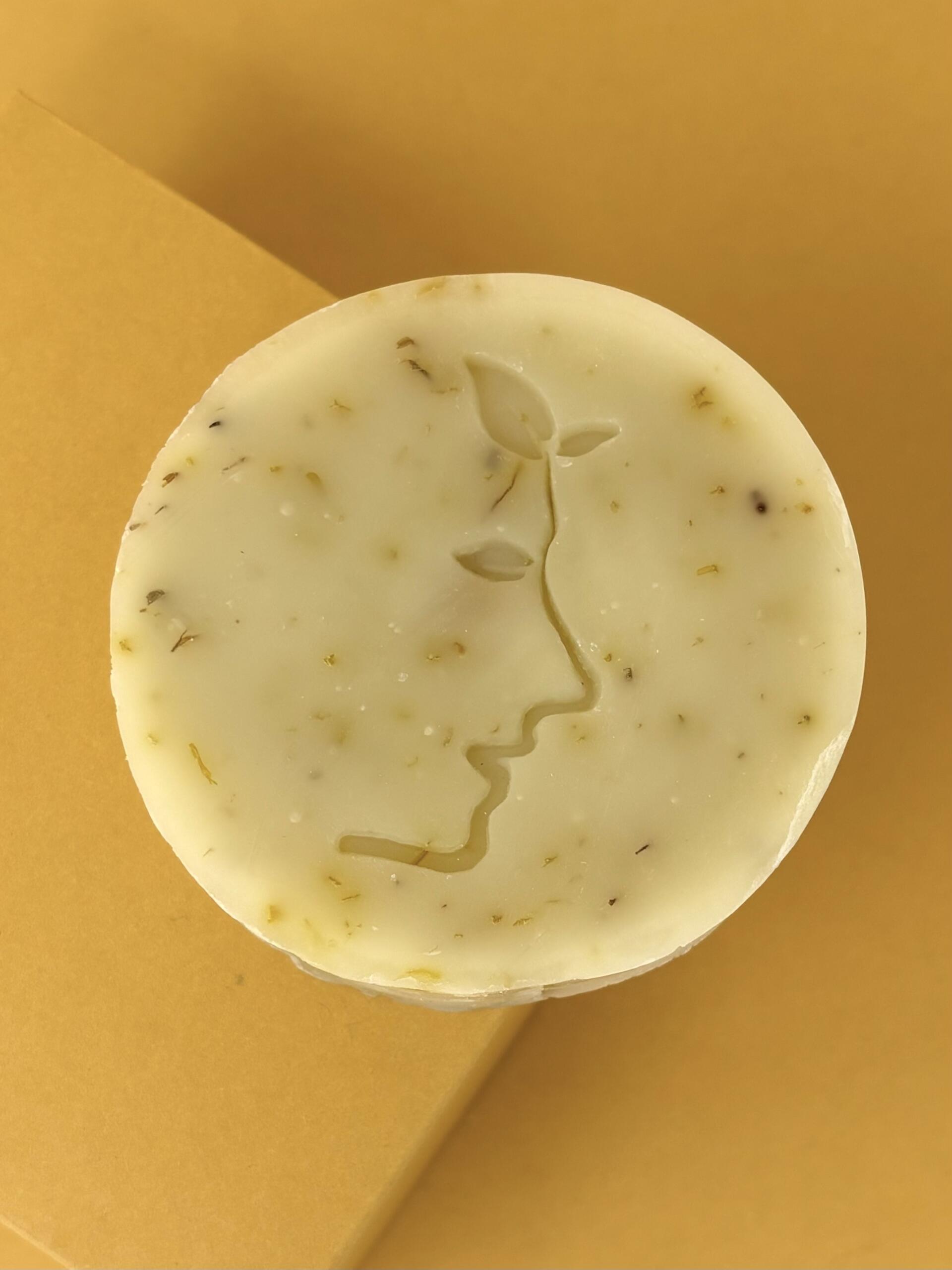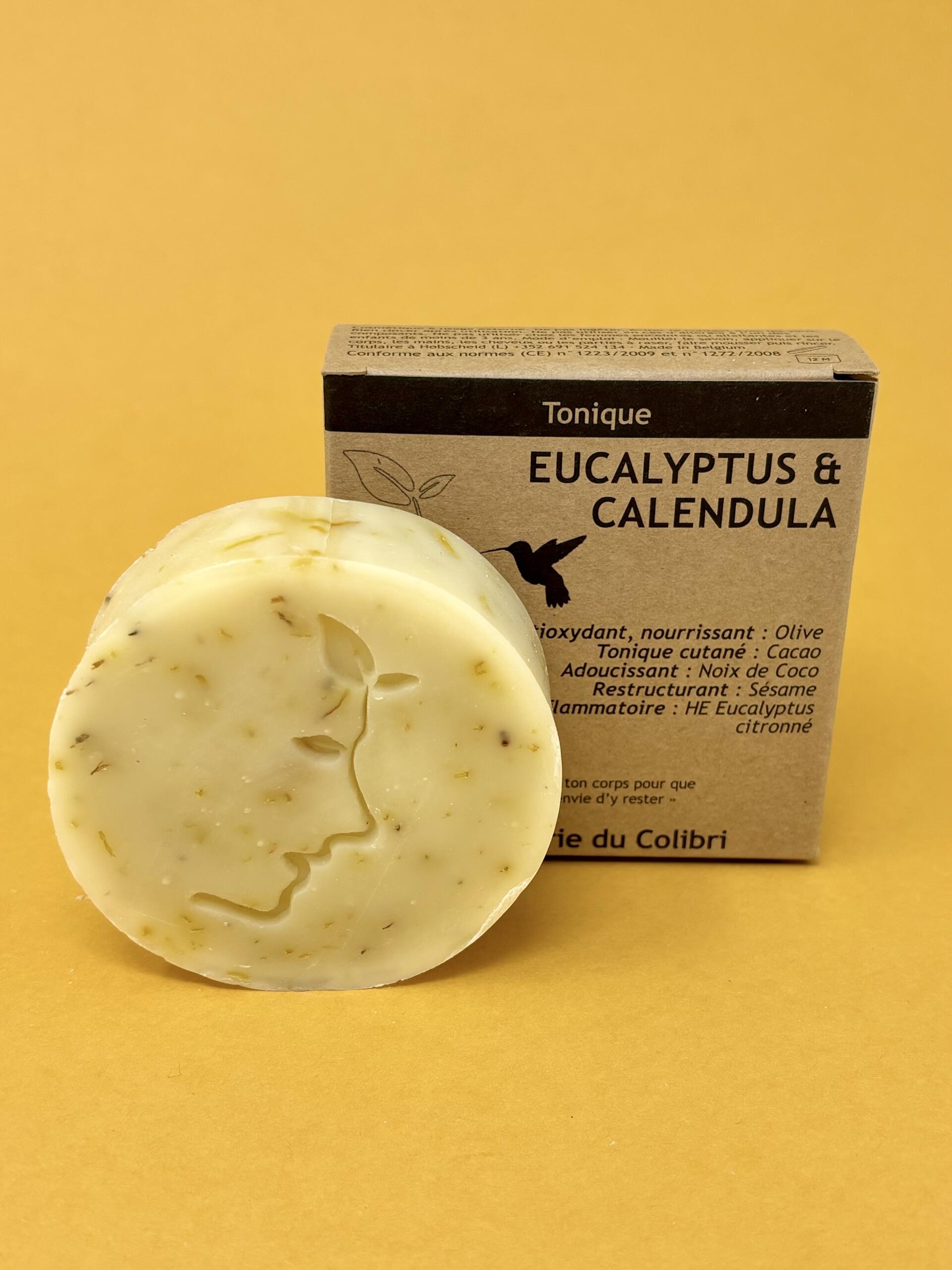 Savon artisanal luxembourgeois, 100 % naturel, au Calendula et Eucalyptus, apaisant et anti-inflammatoire pour les peaux sensibles et rugueuses.