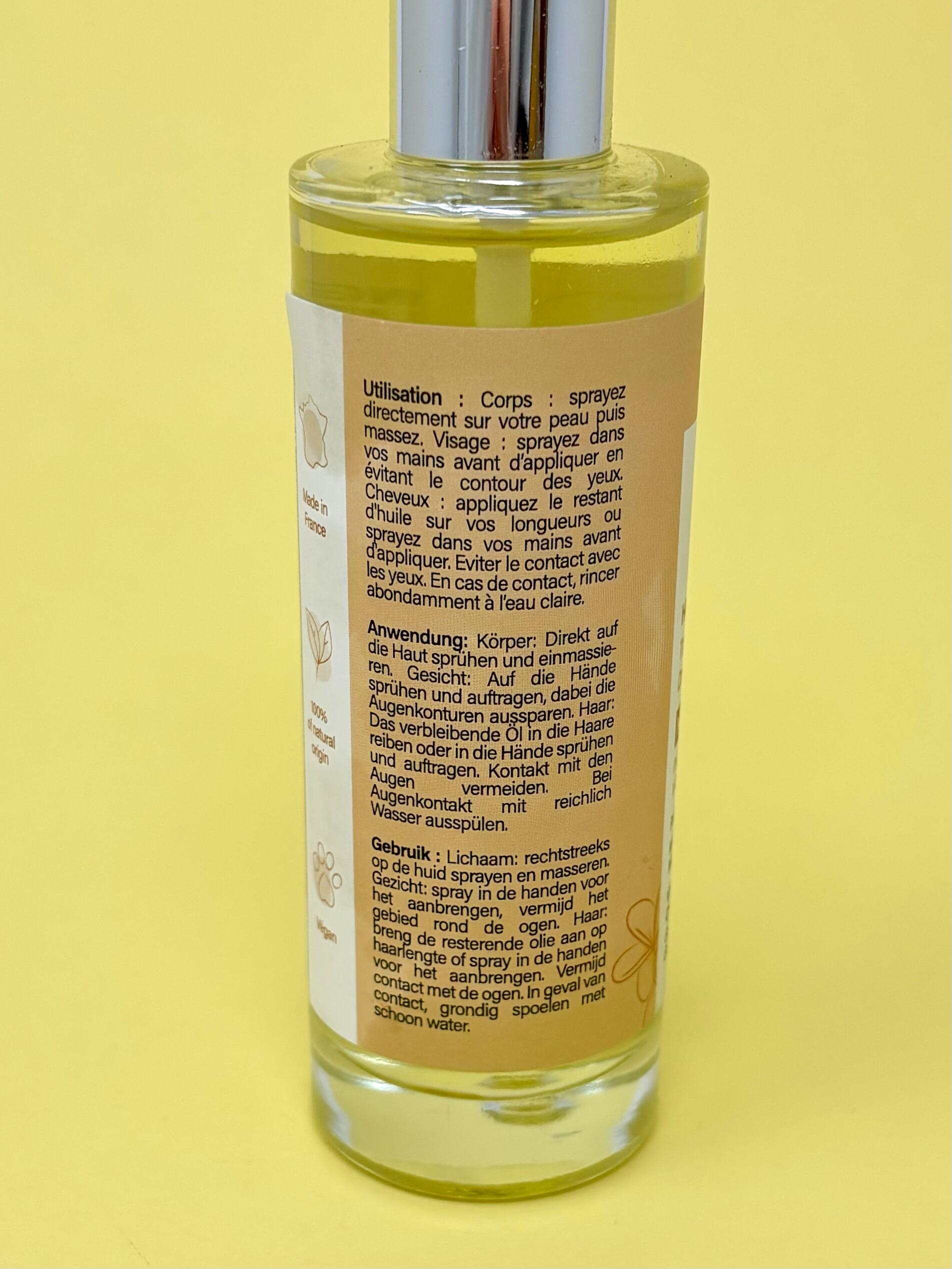 Huile 3 en 1 nourrissante pour visage, corps et cheveux, réparatrice et apaisante, sans film gras.
