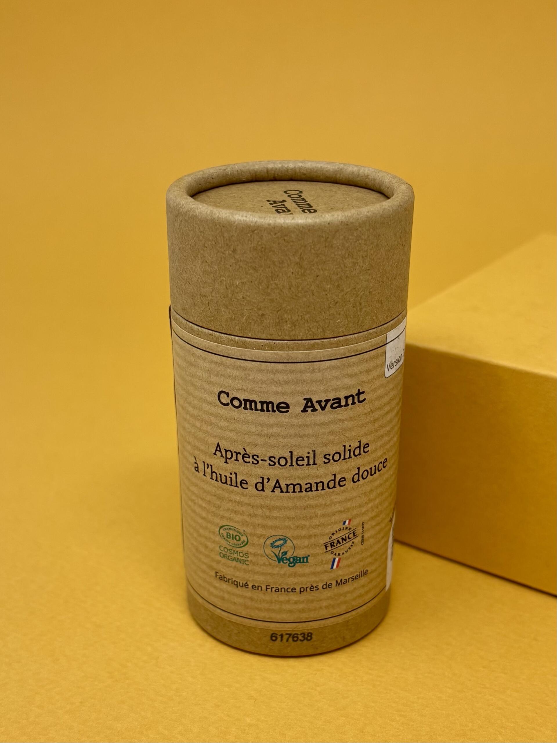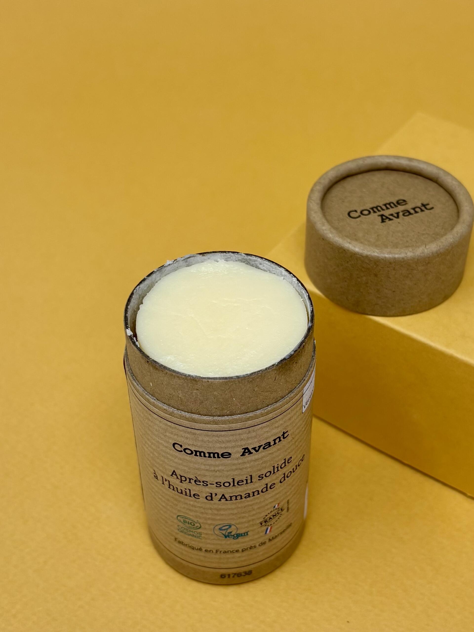 Un après-soleil solide minimaliste, sans parfum, à l’huile d’amande douce pour apaiser et nourrir naturellement la peau.