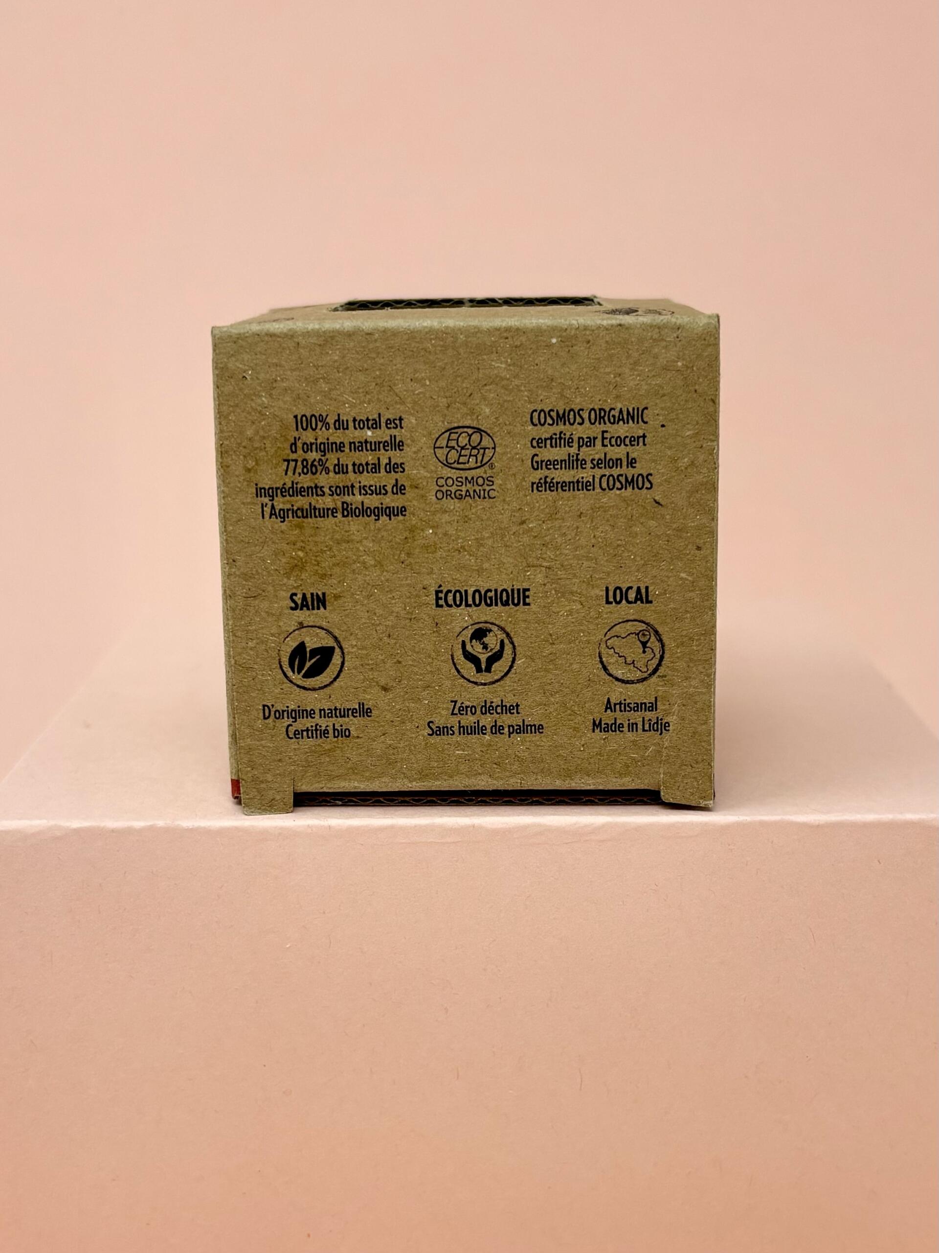 Ce savon 100 % végétal, fabriqué artisanalement à Liège, est enrichi en huile de sésame et en marc de café pour nettoyer, hydrater et réparer les mains très sales, tout en restant doux pour un usage quotidien. Grâce au niaouli et à la lavande, il possède des propriétés antibactériennes, cicatrisantes et apaisantes. Sans graisses animales ni paraben, il est biodégradable, respectueux de l’environnement et emballé dans un carton recyclable.