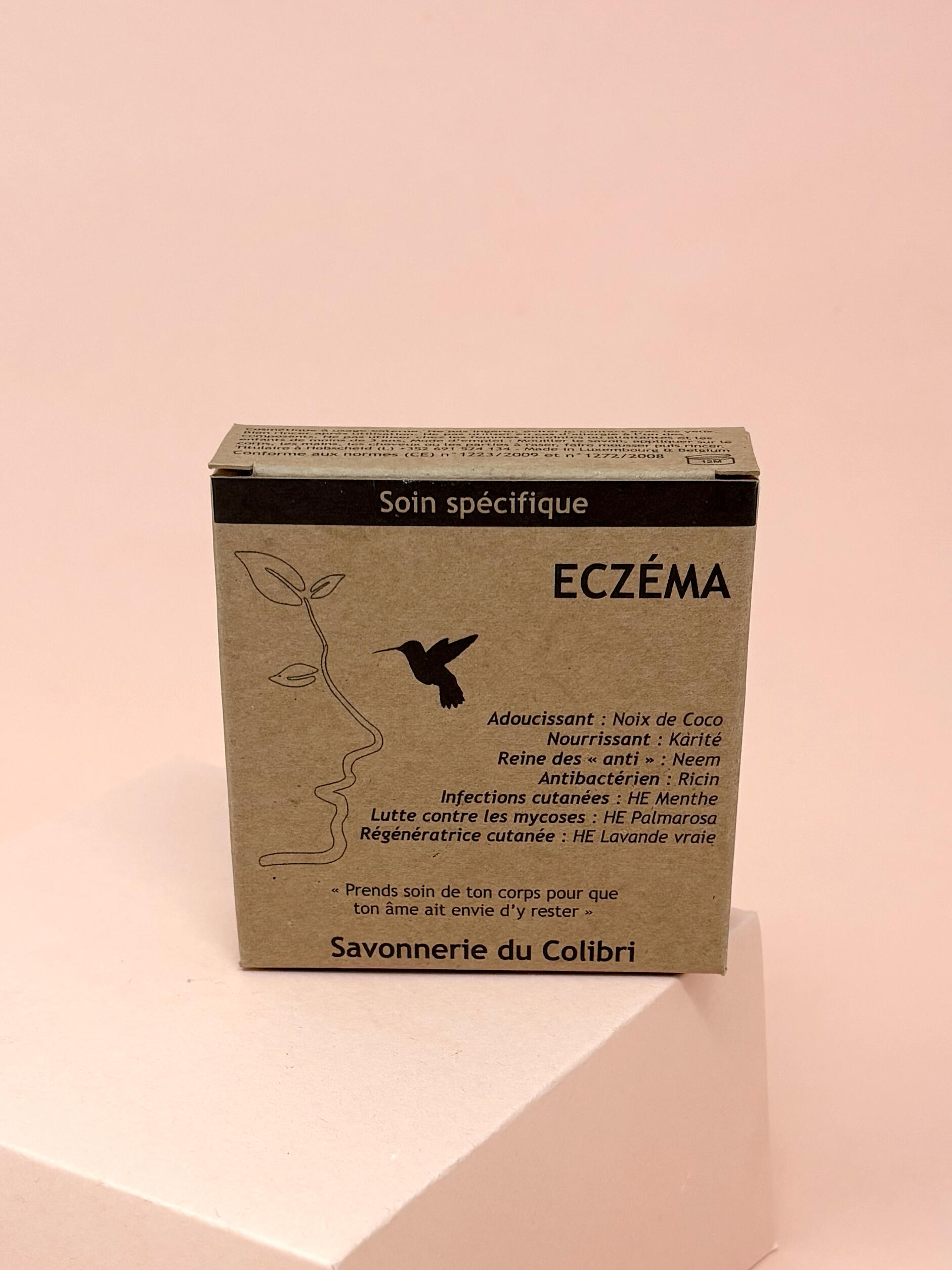 Savon artisanal luxembourgeois, 100 % naturel, au Neem, huile de ricin, karité, olive et huiles essentielles, pour hydrater et nourrir les peaux sensibles ou sujettes à l'eczéma.