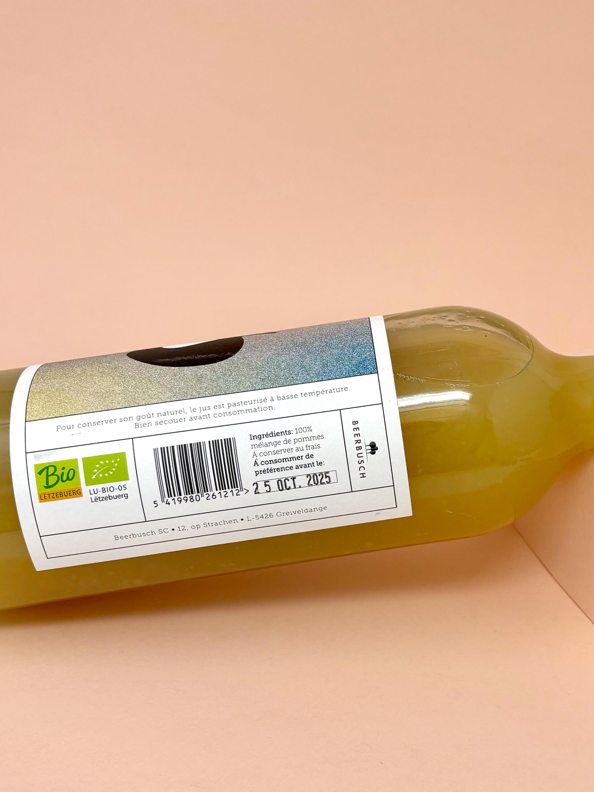 Jus de pomme Beerbusch, frais et naturel, pressé à partir de pommes locales, alliant qualité artisanale et engagement écologique.