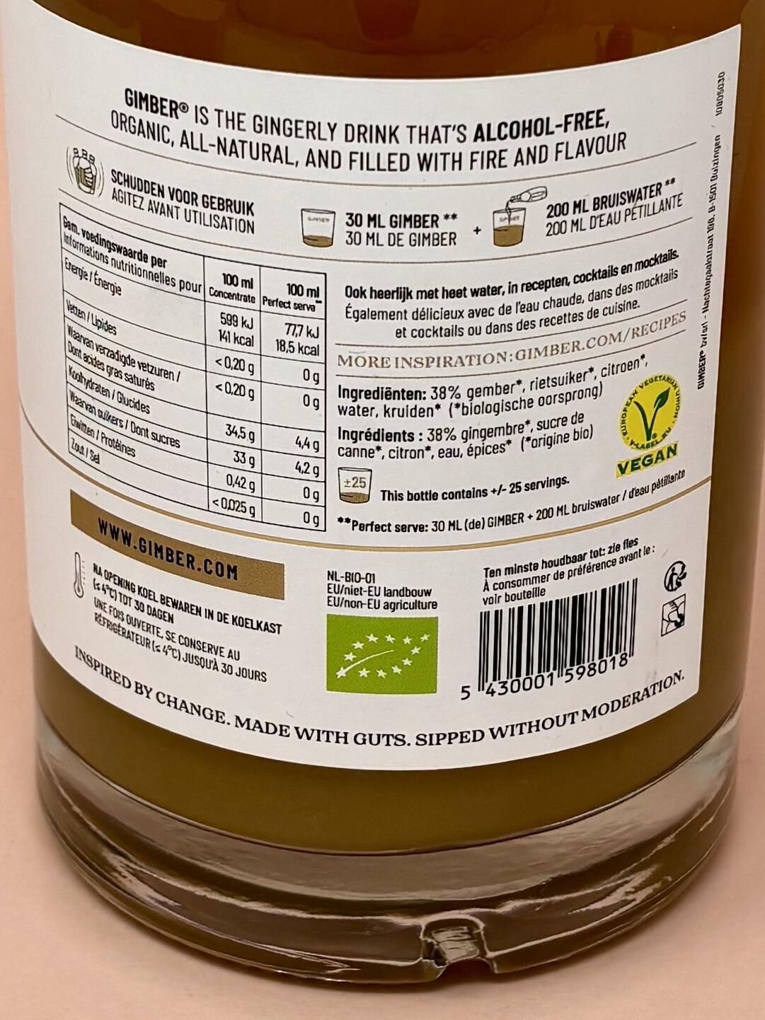 En boisson rafraîchissante : diluez environ 20–30 ml de Gimber dans 200 ml d’eau pétillante ou plate, selon vos goûts. Servez bien frais, avec glaçons, une rondelle de citron ou de menthe.