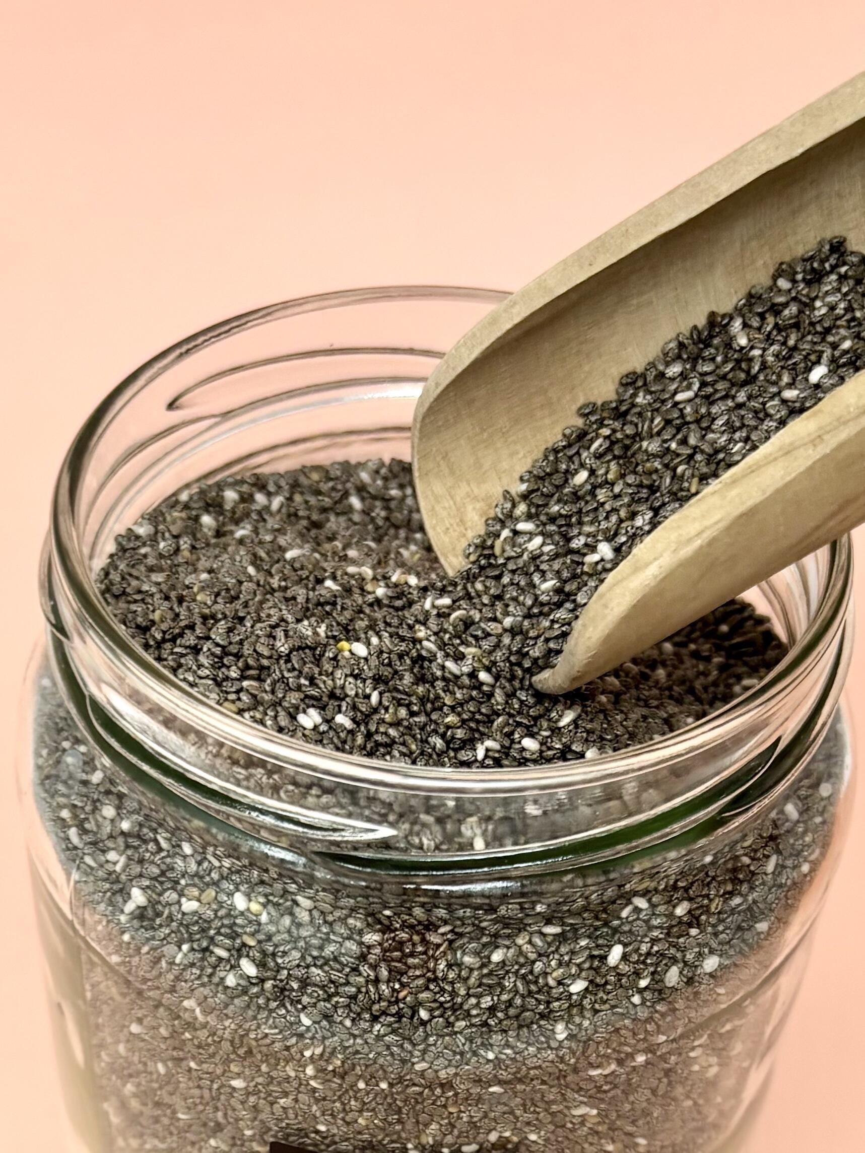 Graines de chia riches en fibres et oméga-3, à saupoudrer ou tremper pour ajouter croquant ou onctuosité aux recettes.
