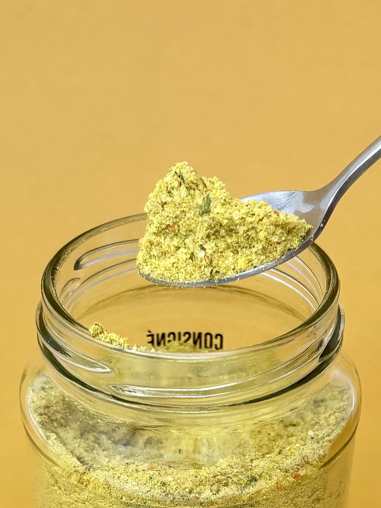 sel de mer, amidon de maïs*, légumes* (21,00%) (carottes*, céleri*, oignons*, panais*, tomates*, poireau*), curcuma*, feuilles de céleri*, feuilles de livèche*, persil*, noix de muscade*, ail*, huile de tournesol*, gingembre', laurier*, piment*.
