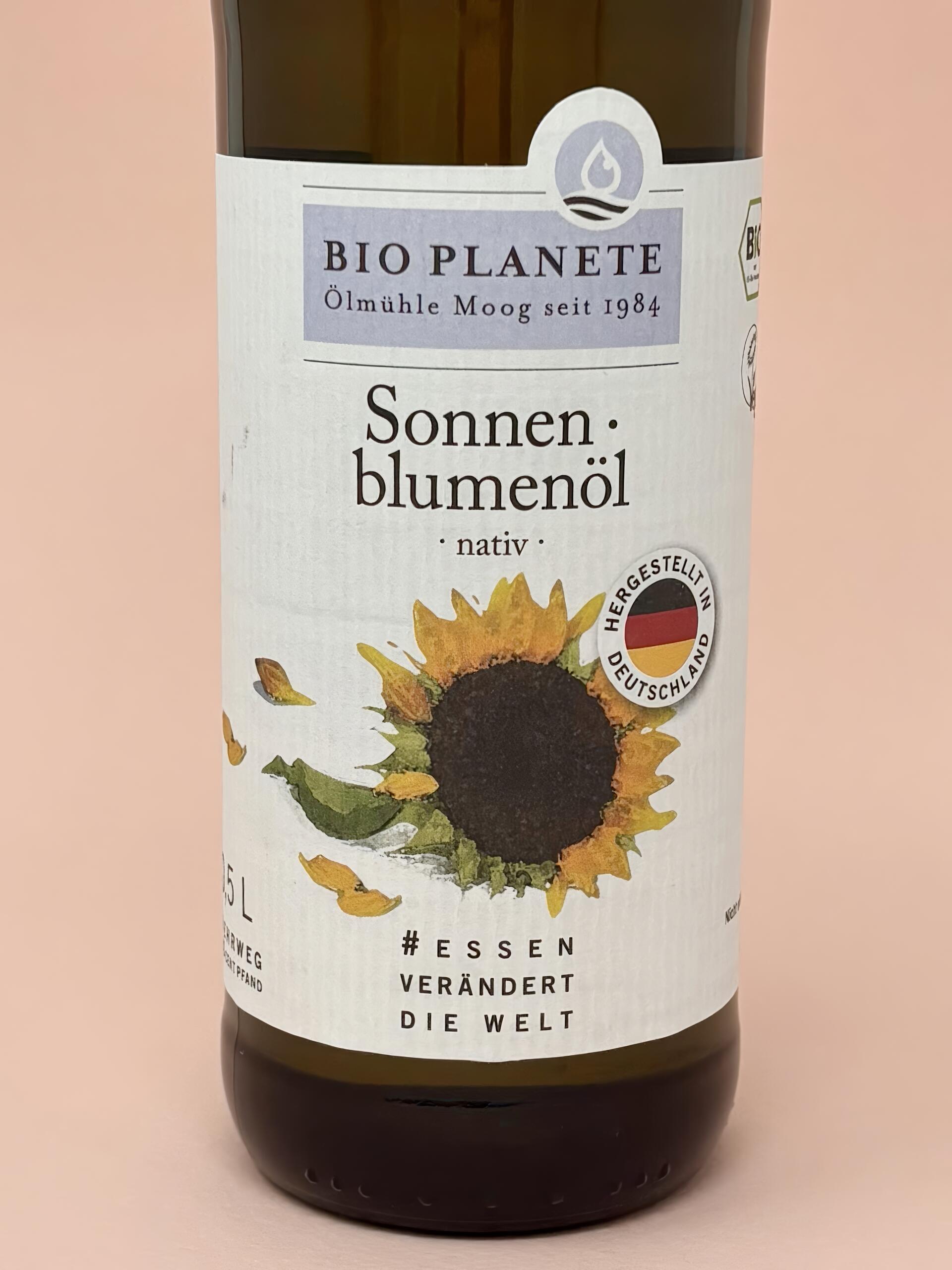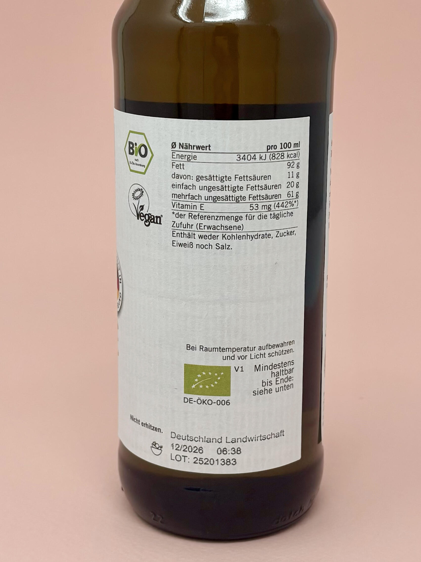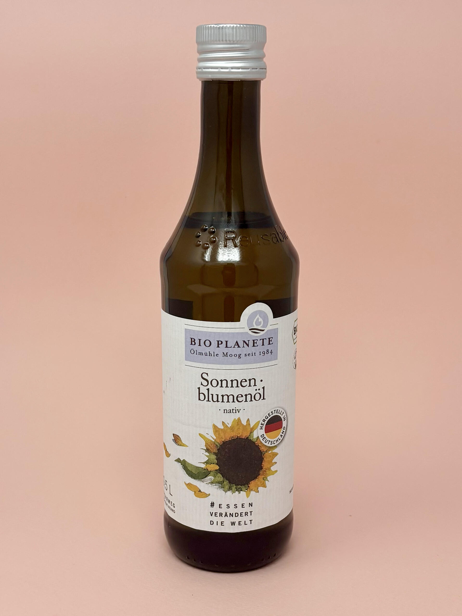 Huile de tournesol première pression à froid, riche en oméga-6 et vitamine E, idéale pour assaisonnements.