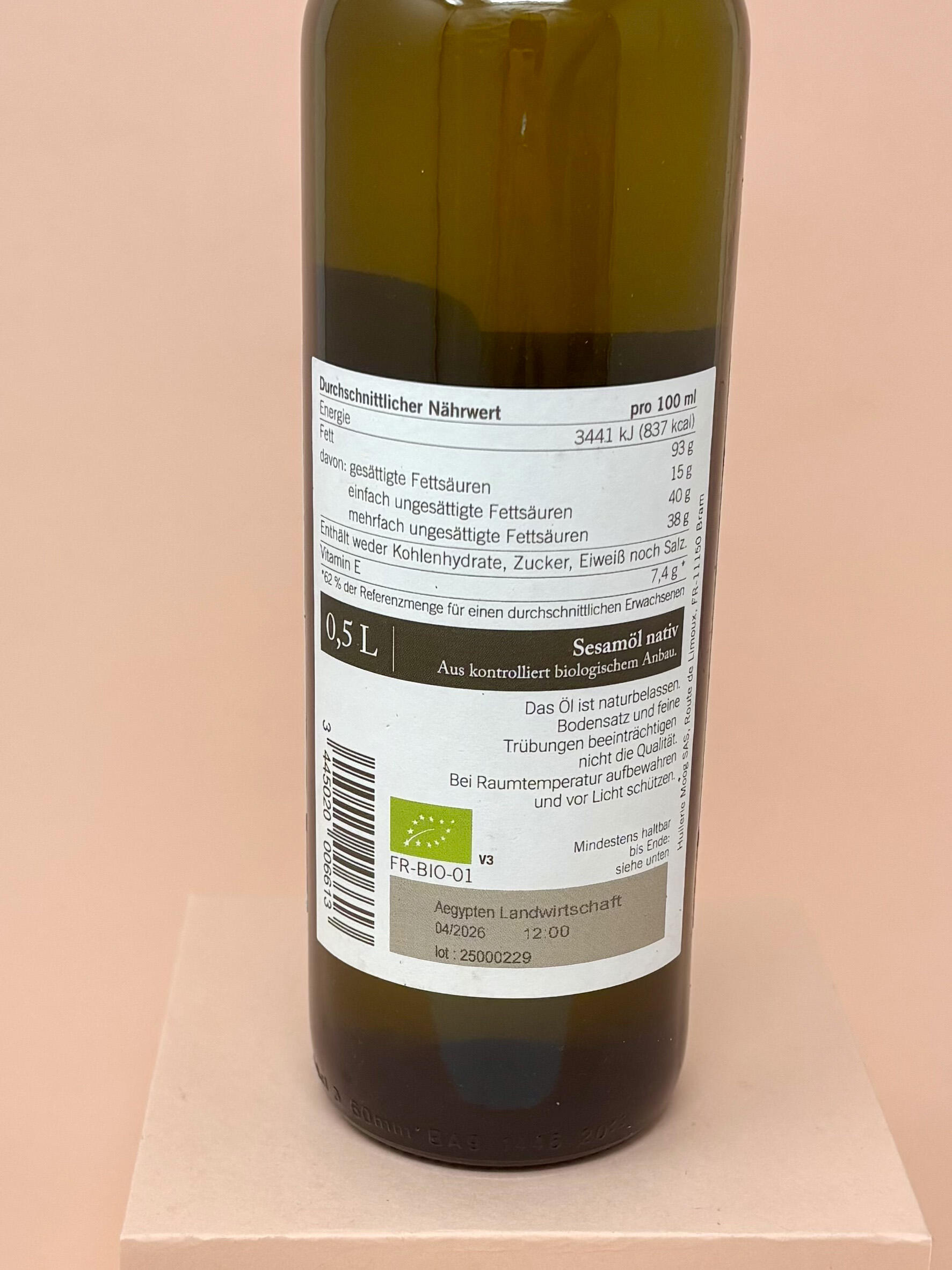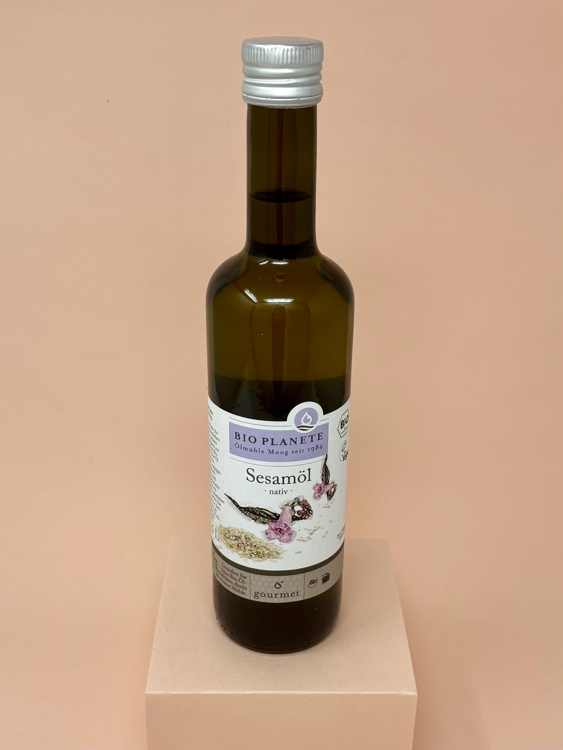 Huile de sésame vierge bio, au goût délicat et céréale.