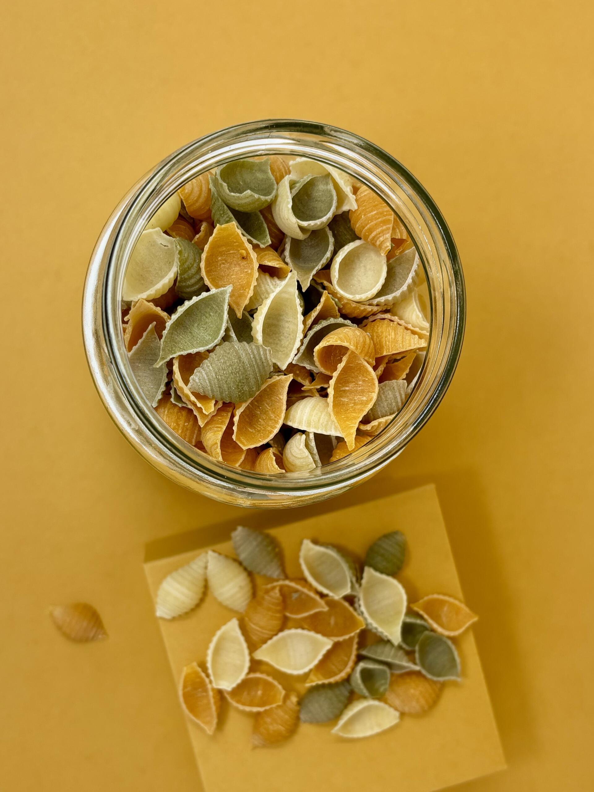 Pâtes artisanales en forme de coquilles, fabriquées à partir d’épeautre, idéales pour accompagner vos plats avec leur saveur douce et rustique.