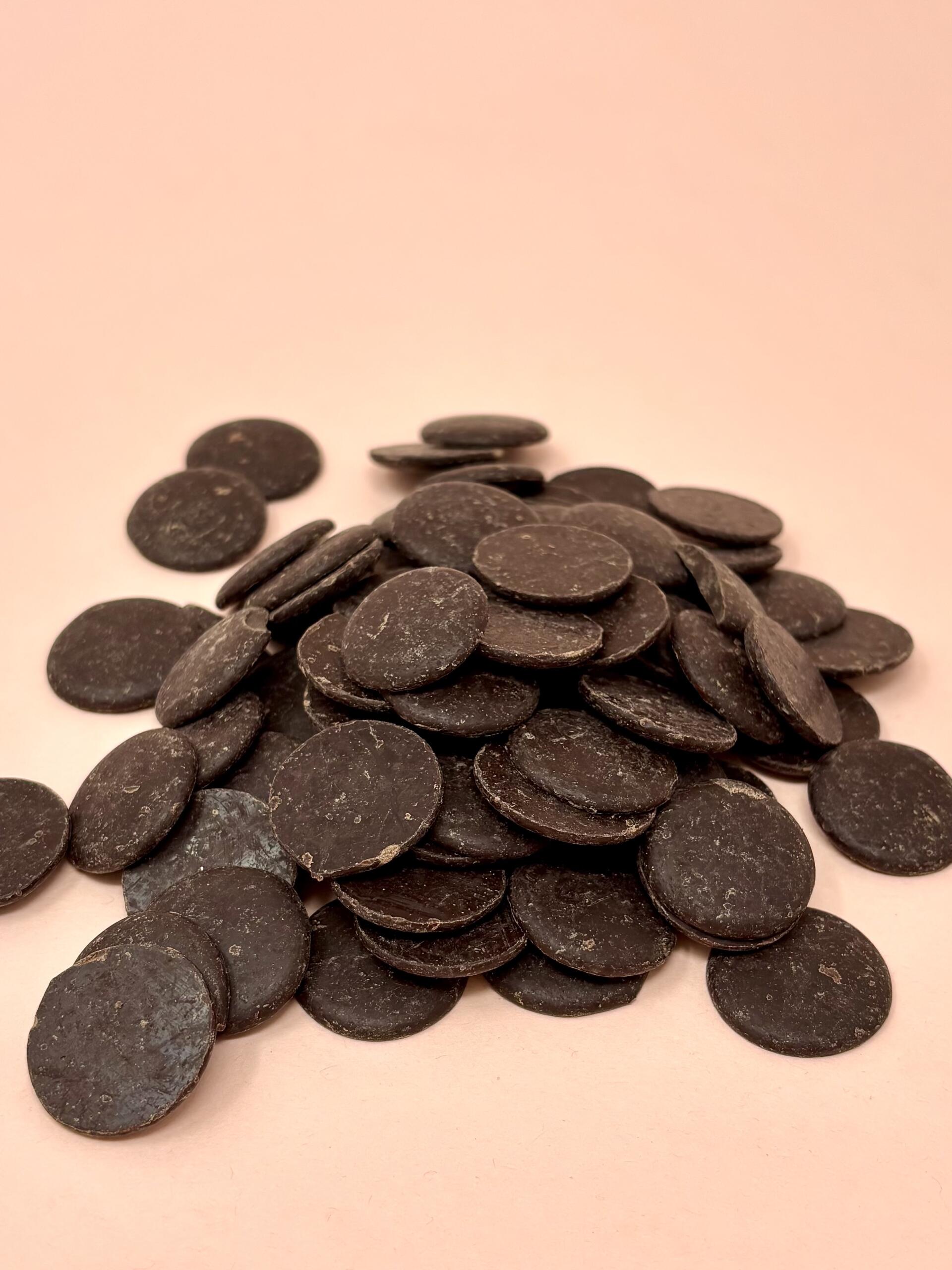 Pastilles de chocolat noir 74% bio, au goût intense, parfaites pour pâtisserie, dégustation ou sauces, issues du commerce équitable.