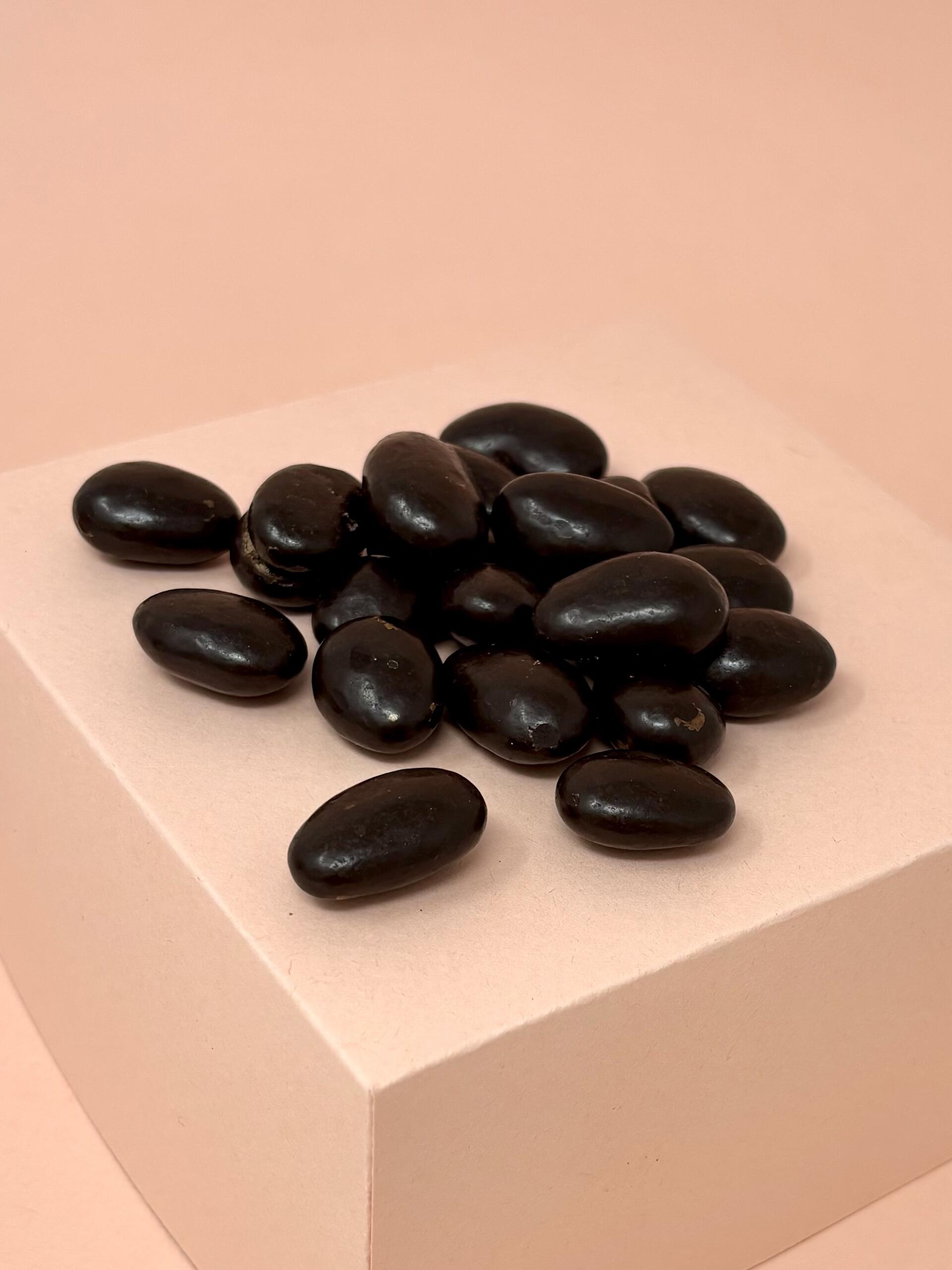 Amandes enrobées de chocolat noir intense, offrant un équilibre croquant-fondant.