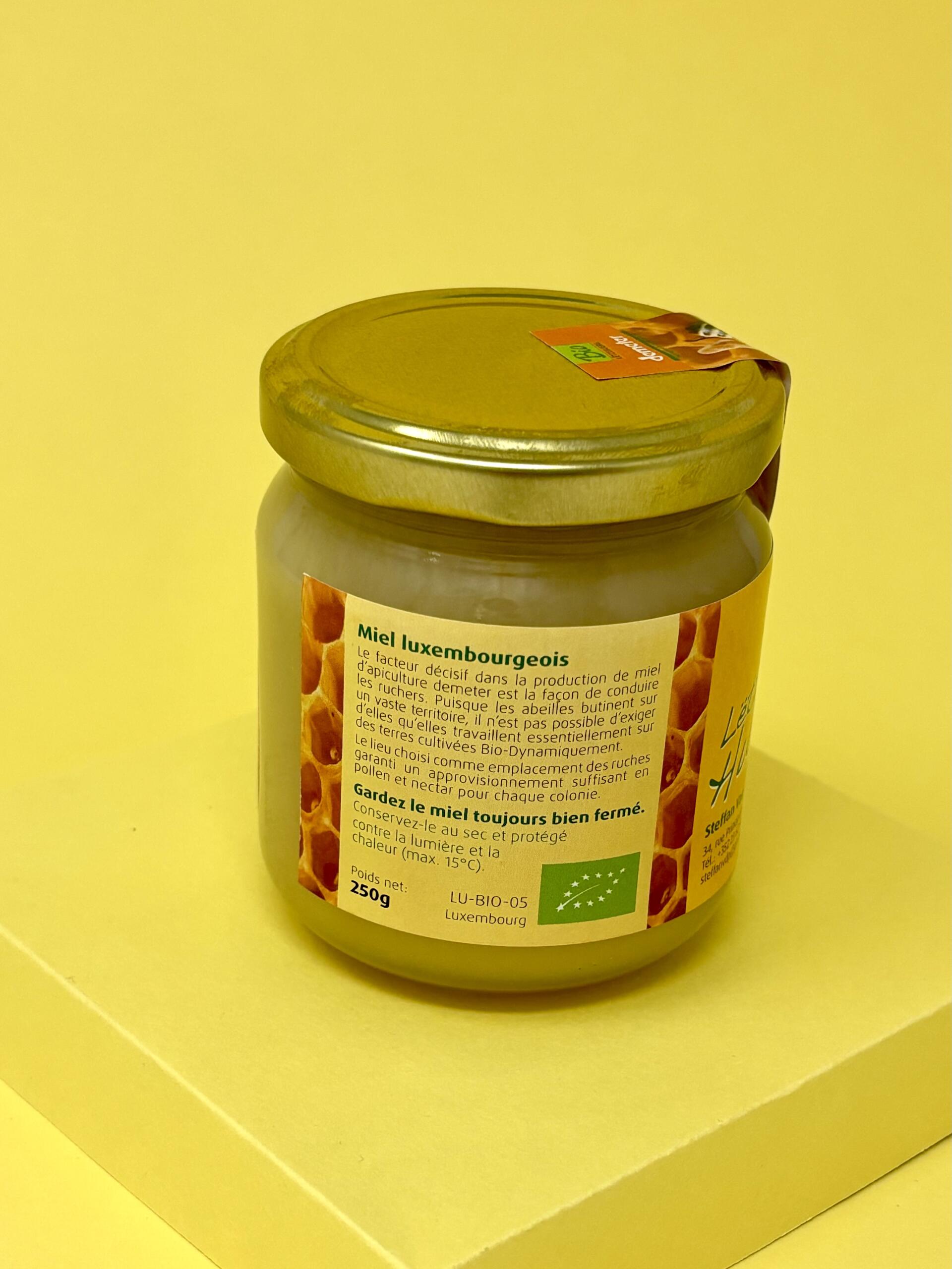 Miel crémeux bio, récolté respectueusement, préservant ses arômes et propriétés naturelles, avec option de réutilisation des bocaux.