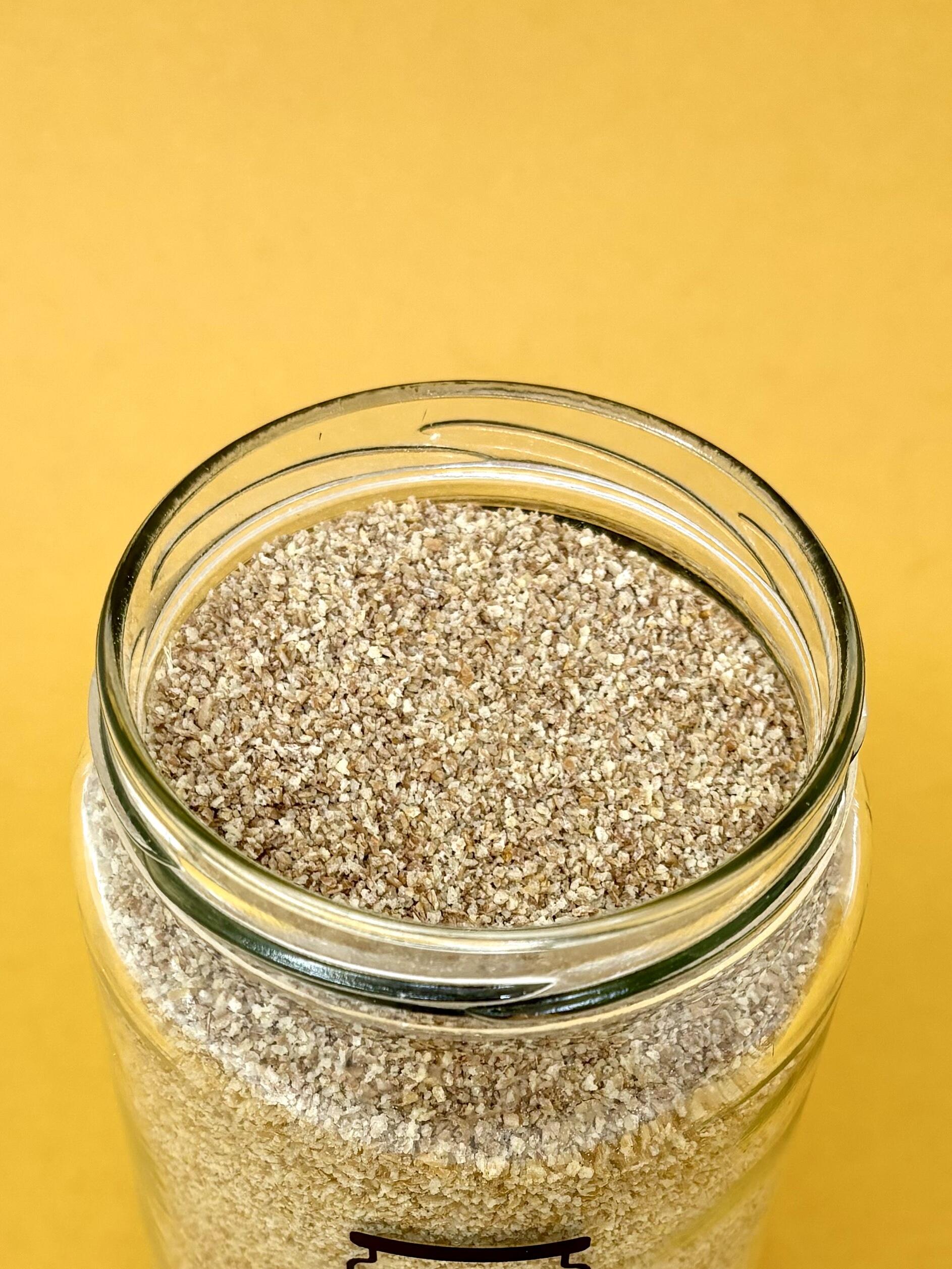 Chapelure à base de pain complet de froment, séchée et finement broyée, riche en fibres et nutriments.