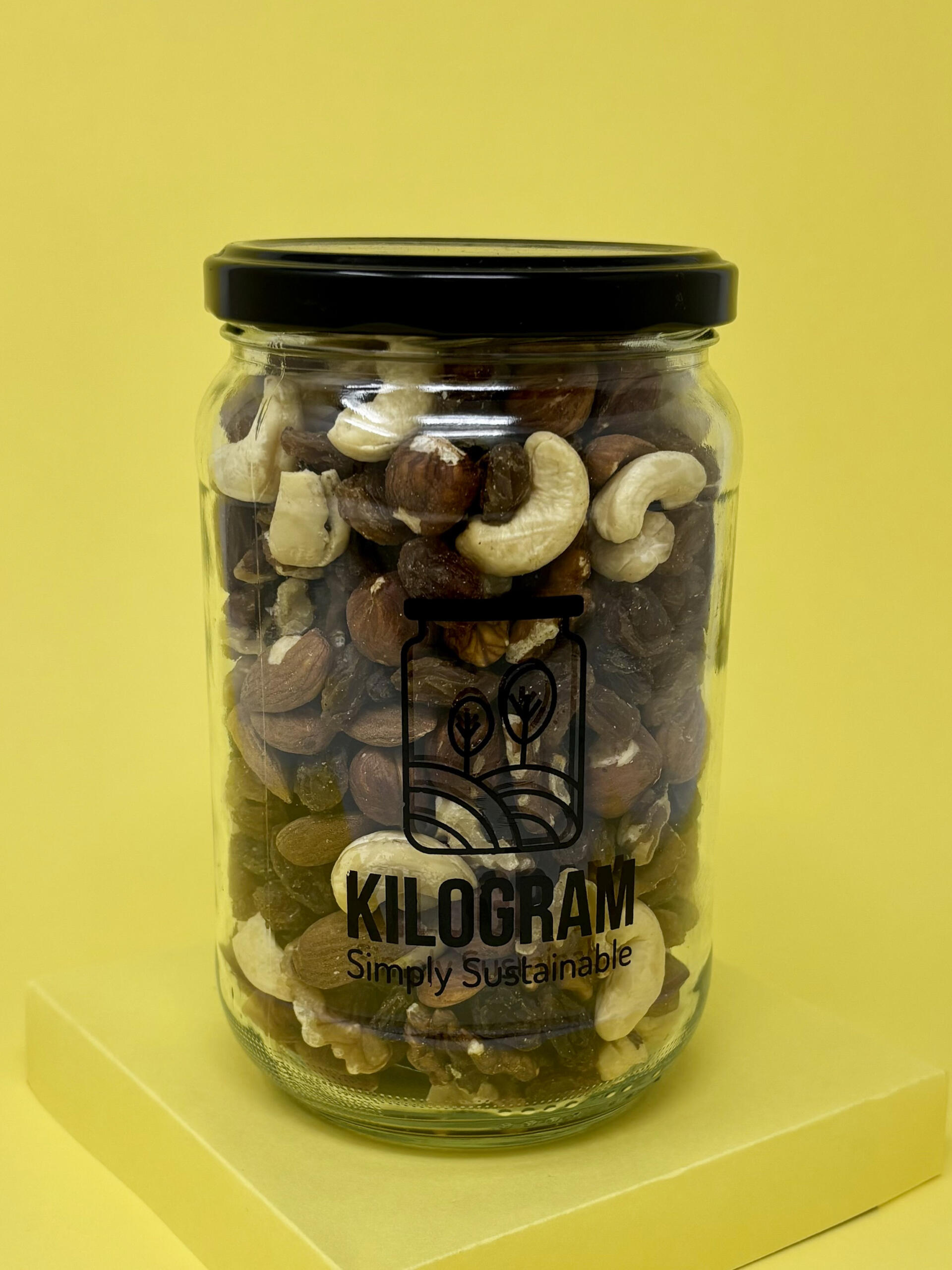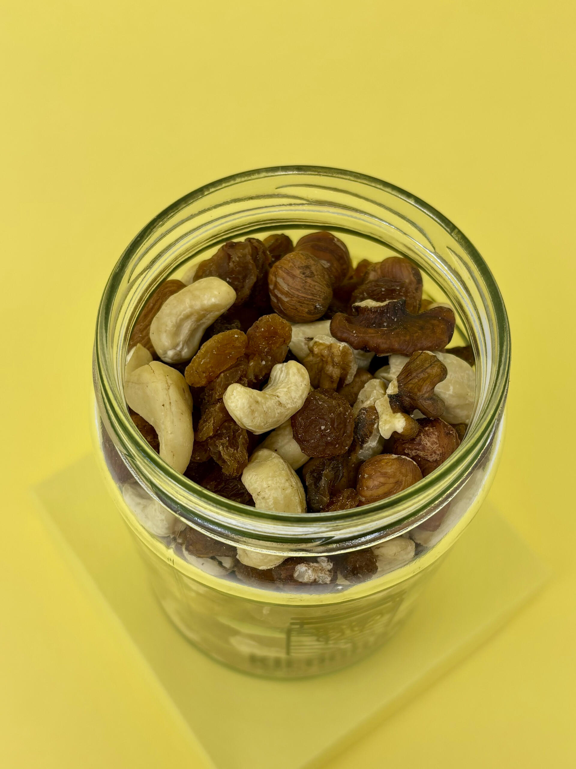 Mélange de raisins secs, noix et graines, sucré-salé, riche en fibres et antioxydants.