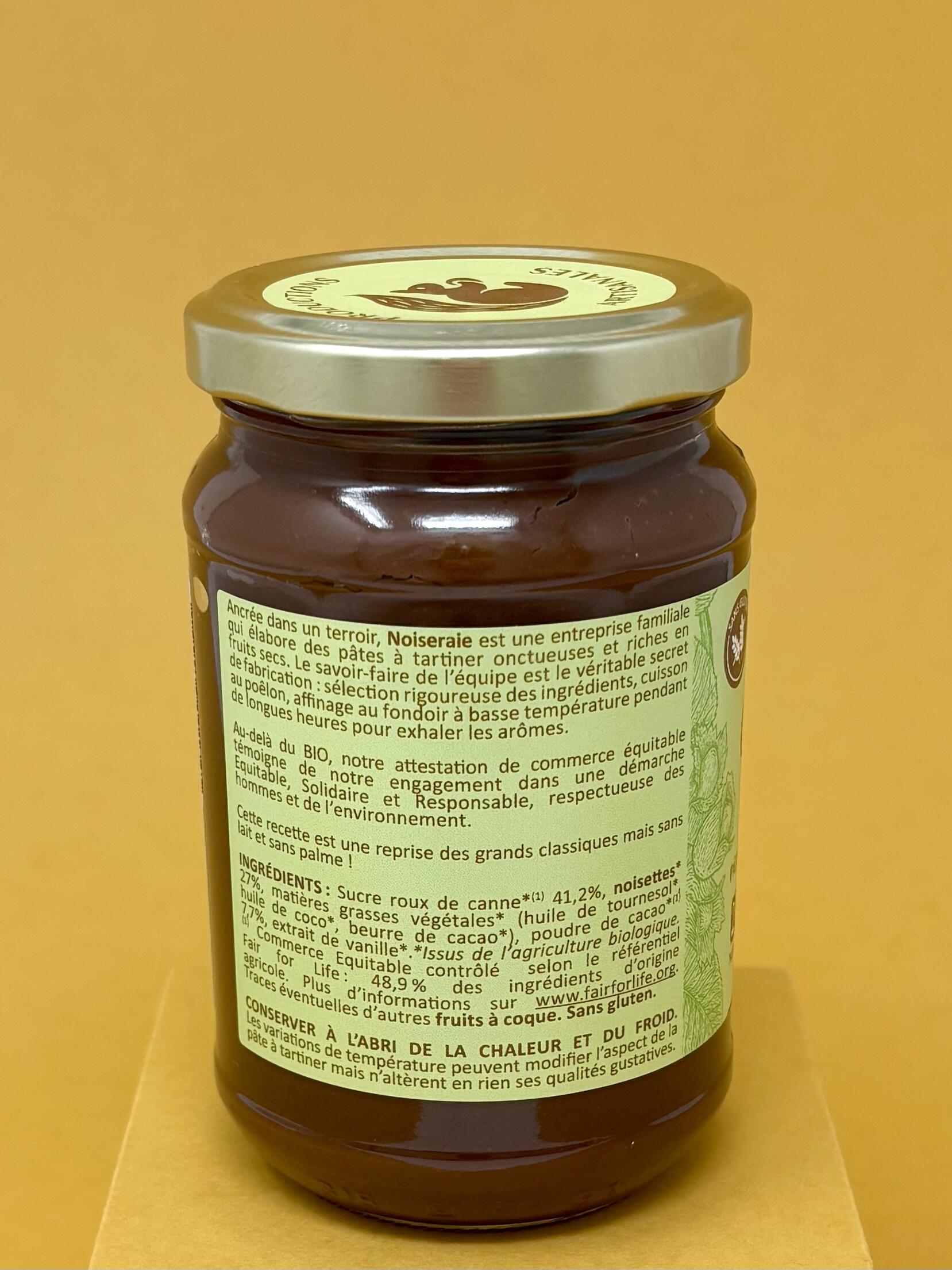 Sucre de canne roux*(1) 41.3% (Brésil, Paraguay), noisettes* 27% (Turquie/Italie), Matières grasses végétales* (huile de tournesol*, huile de coco*, beurre de cacao*), Poudre de cacao*(1) 7.7% (République Dominicaine, Pérou, Equateur, Sao Tomé, Ghana), Extrait de vanille*.