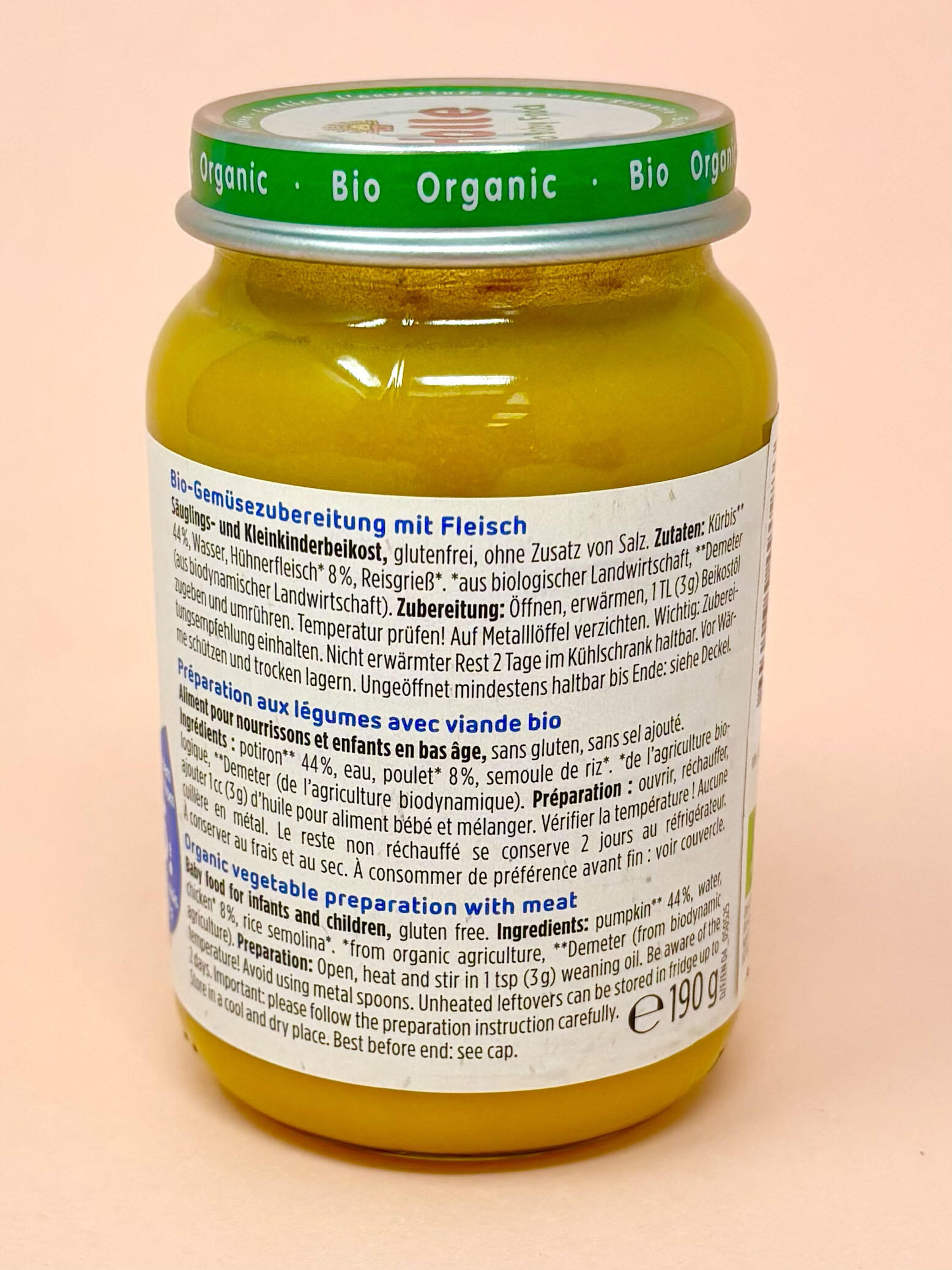 Cette purée associe la douceur du potiron à des protéines de poulet de qualité biologique. Elle apporte un repas complet et équilibré pour les bébés en pleine croissance. Sa texture lisse facilite la prise en bouche.