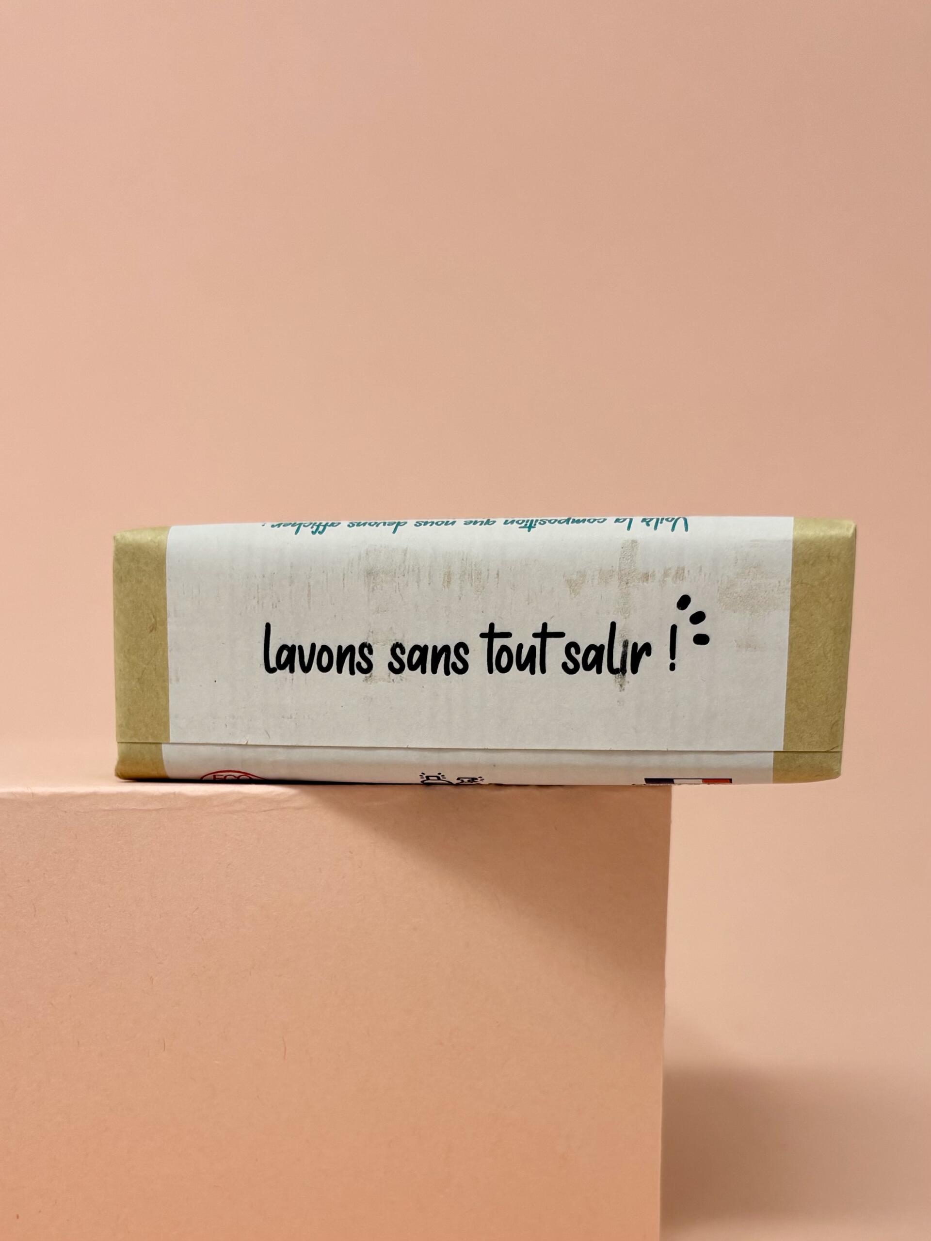 Savon de Marseille solide, 100% naturel et recyclable, remplaçant 4 bouteilles de liquide vaisselle, avec huile d'olive, de coprah et bicarbonate pour une vaisselle propre et écologique.