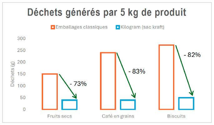 Nos produits sont proposés en grandes quantités, conditionnés dans des sacs en papier kraft recyclables, bien plus légers et respectueux de l'environnement que les emballages plastiques ou individuels.